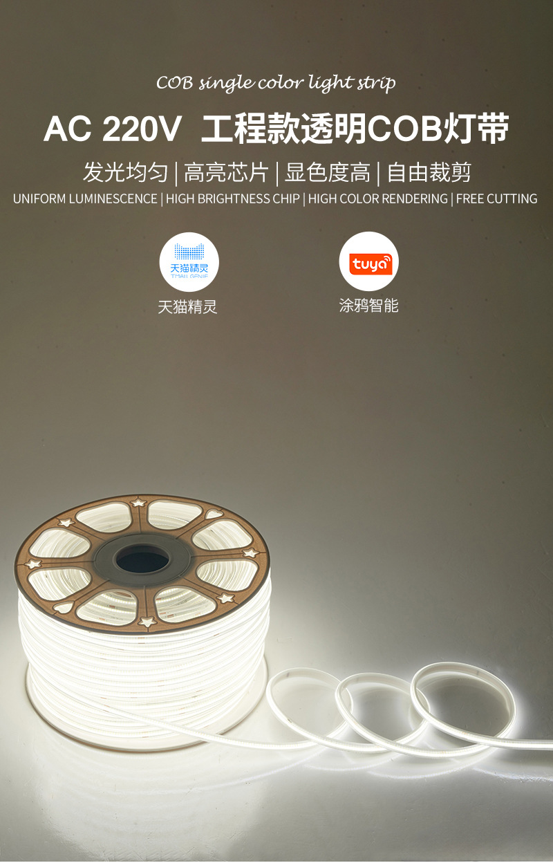 高压透明COB灯带220V户外防水工程室内家用吊顶无暗区柔性灯带